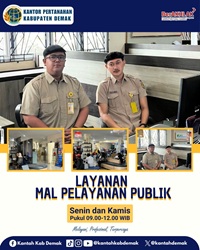 Kamis, 15 Desember 2025 — Kantor Pertanahan Kabupaten Demak kembali menghadirkan pelayanan pertanahan di Mal Pelayanan Publik (MPP) Demak sebagai bagian dari upaya meningkatkan kemudahan akse... Selengkapnya